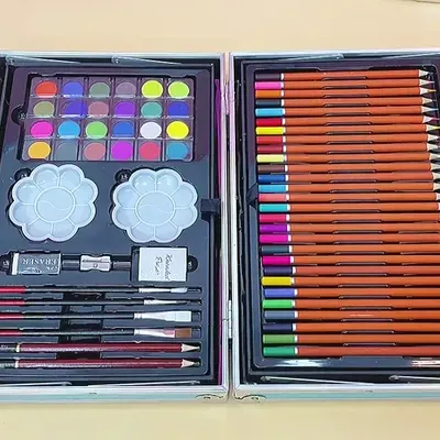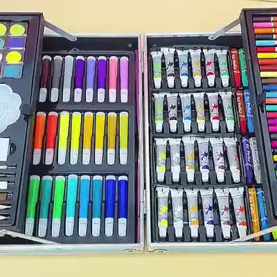 Комплектът за рисуване с 145 части събира всичко необходимо за творчество в удобен, здрав куфар с дръжка.